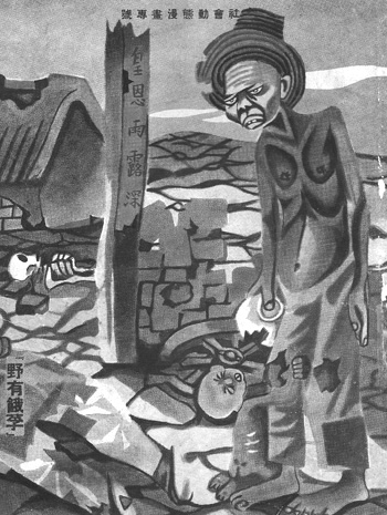 张仃不是高产的漫画创作家,在30年代漫画最鼎盛的时期,他的名气不如张光宇、汪子美、鲁少飞、王敦庆他们,只比他大一岁的丁聪当时也比他名气大。经历和他差不多1938年也去了延安鲁艺的华君武,当年的漫画产量也比他多很多。张仃虽然创作不多,却几乎每幅都是经典之作,像《野有饿殍》(见图1),再深刻不过地表达了他漫画创作的主旨,那就是“民间疾苦笔底波澜”,用画笔为贫苦大众呼喊。